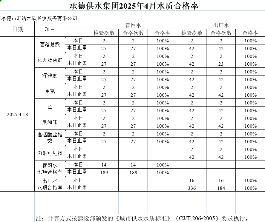 承德供水集團(tuán)2025年4月18日水質(zhì)合格率