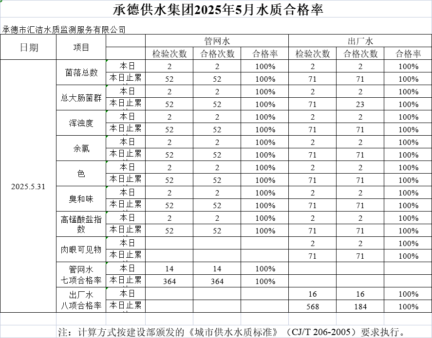 承德供水集團(tuán)2025年5月31日水質(zhì)合格率